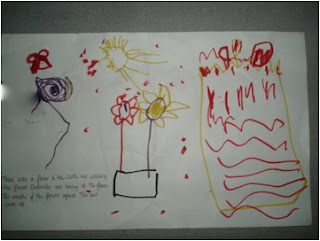 With their permission I recorded their stories and played it back to them. They expressed a great deal of excitement and pride, wanting to have their peers listen to it as well. From here, I presented the idea of writing these stories out and them drawing the image they wanted to accompany their descriptions. I sensed a little bit of hesitation but one of the children wanted to make a whole different story instead. Er. wanted to draw her pictures and wanted me to write out the words providing a story for the images she drew. Em. followed suit and began her own little story book as well. I took the lead from each child who went as far as telling me exactly where they wanted their words written out on their picture! Once I completed their storybooks they were quick to share with their peers who listened intently. This motivated five other children to create their own storybooks, which they also shared with their peers, teachers and parents. (I have provided a few examples below)